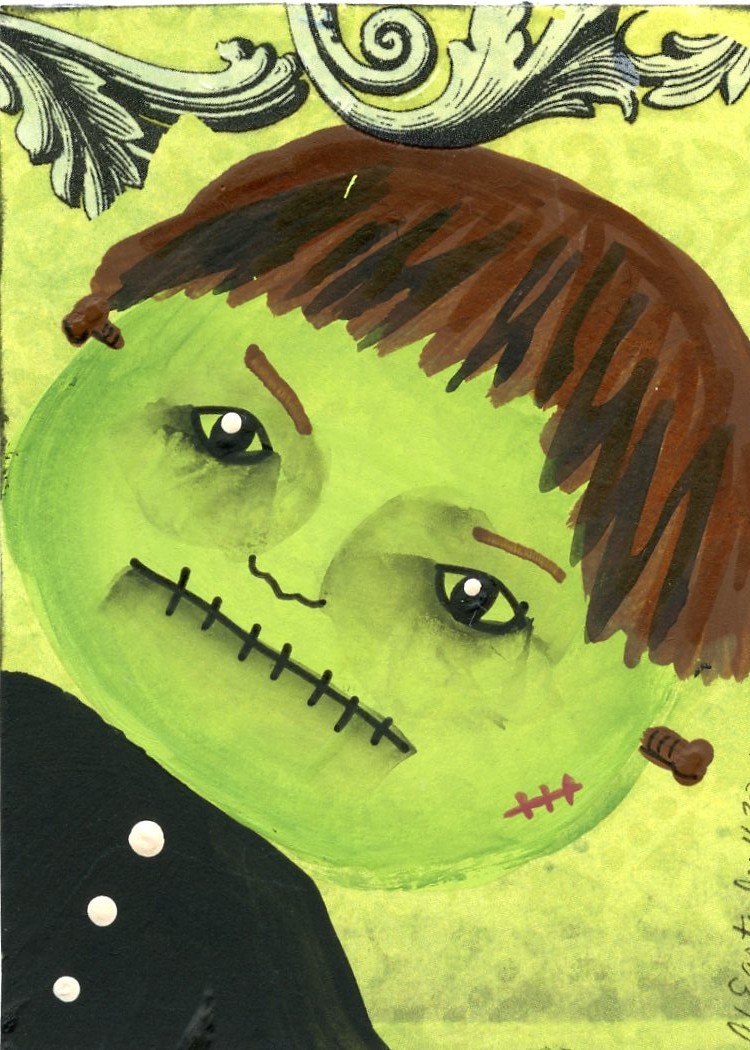 I painted these cutie-monsters with acrylics on art paper with rub-on fleurs at the top.